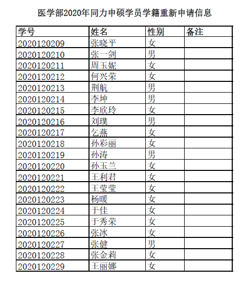 已进入论文阶段同力申硕学员因学籍期满未能开展学位申请工作,经本人申请重新进行学籍注册,经审核,以下学员完成重新申请学籍注册工作,详见下表。请以下学员于11月15日(周日)前将学籍注册材料(按照材料填写要求,完成单位签字、盖章及学费发票复印件黏贴)交至医研办(登州路38号北教学楼2楼)赵老师处,联系电话0532-82991010。